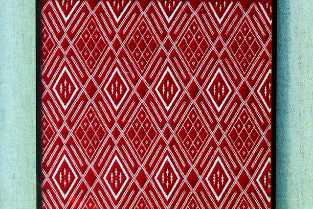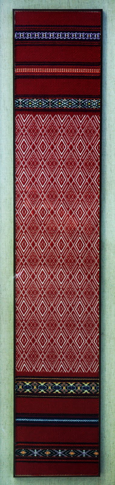 這是泰雅族北勢群的新娘服支片,織紋裡綿延的盡是母親對即將自組家庭的女兒的愛與期待:織紋裡的大菱形紋,是祈求祖靈的庇佑; 小的菱形紋,則是對女兒的疼愛,視女兒為貴重的銅鍋; 對立的三角形則是期許女兒成為家中的杵臼,能夠照料溫飽並延續生命。